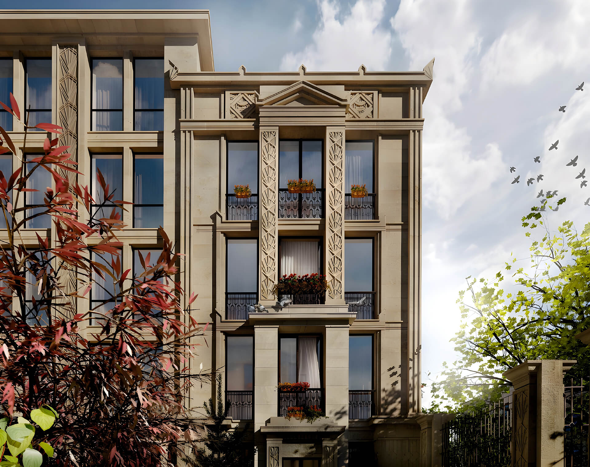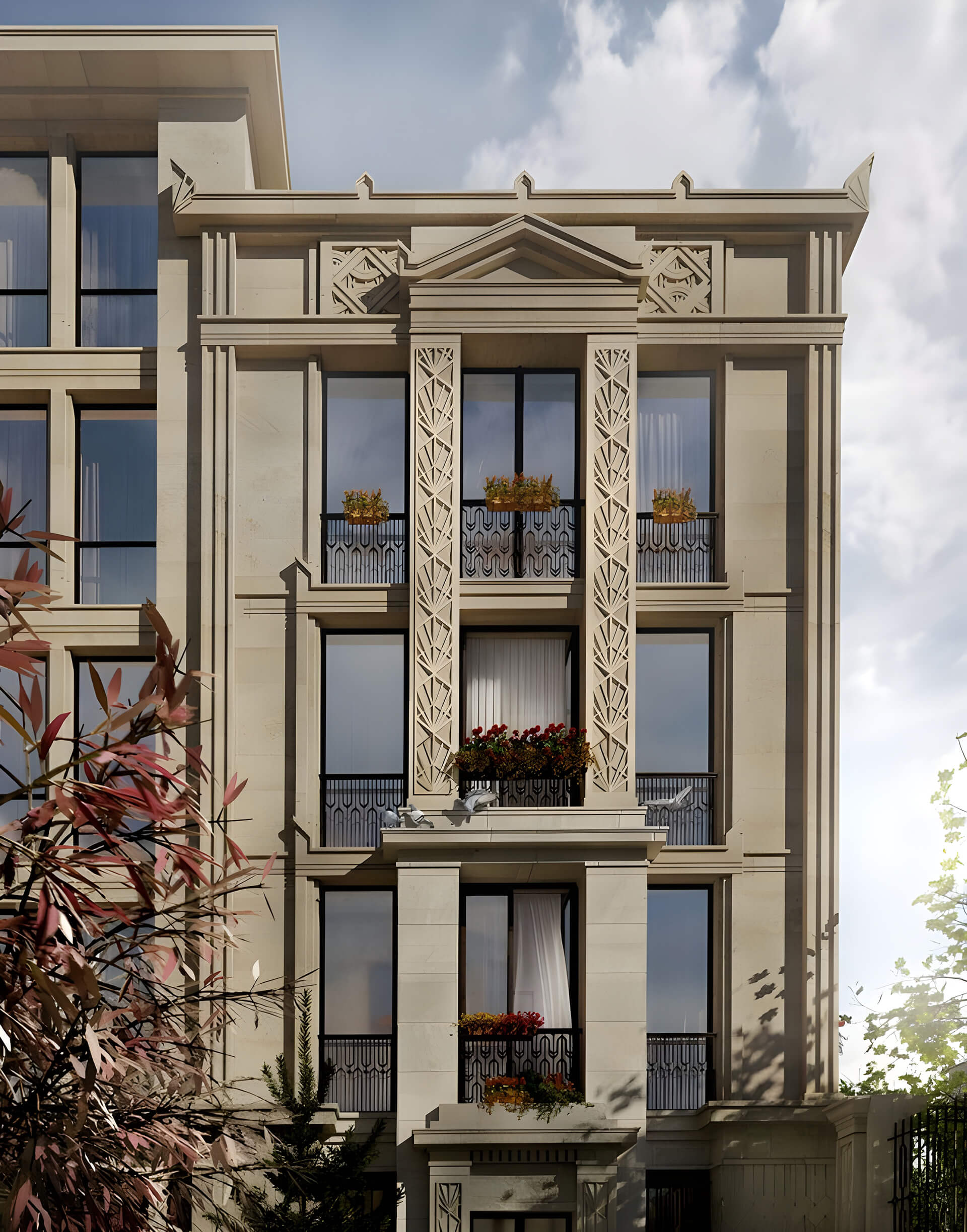 Дизайн лобби отражает дух Франции и архитектурный стиль комплекса: через декоративные детали, колонны и гипсовые панно, напоминающие мотивы парижского модерна. Это приветственное пространство создает первое впечатление о жилом комплексе как о месте, где качество, стиль и комфорт идут рука об руку.