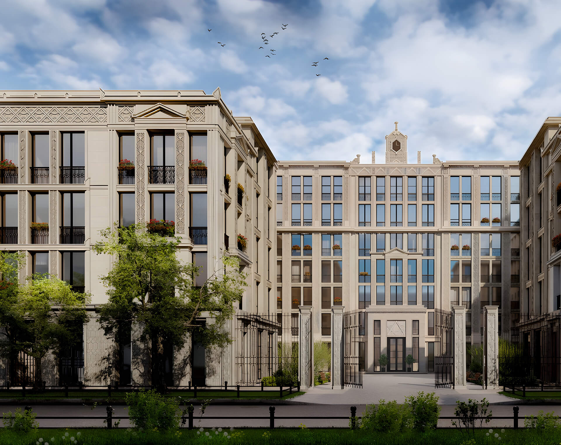 Внутренний двор комплекса спроектирован как курдонёр — приватное, закрытое пространство между симметричными корпусами, создающее тихую зону отдыха. Такое решение позволяет избегать традиционного «двор-колодца», наполненного тенью, и обеспечивает хорошее освещение и вентиляцию.