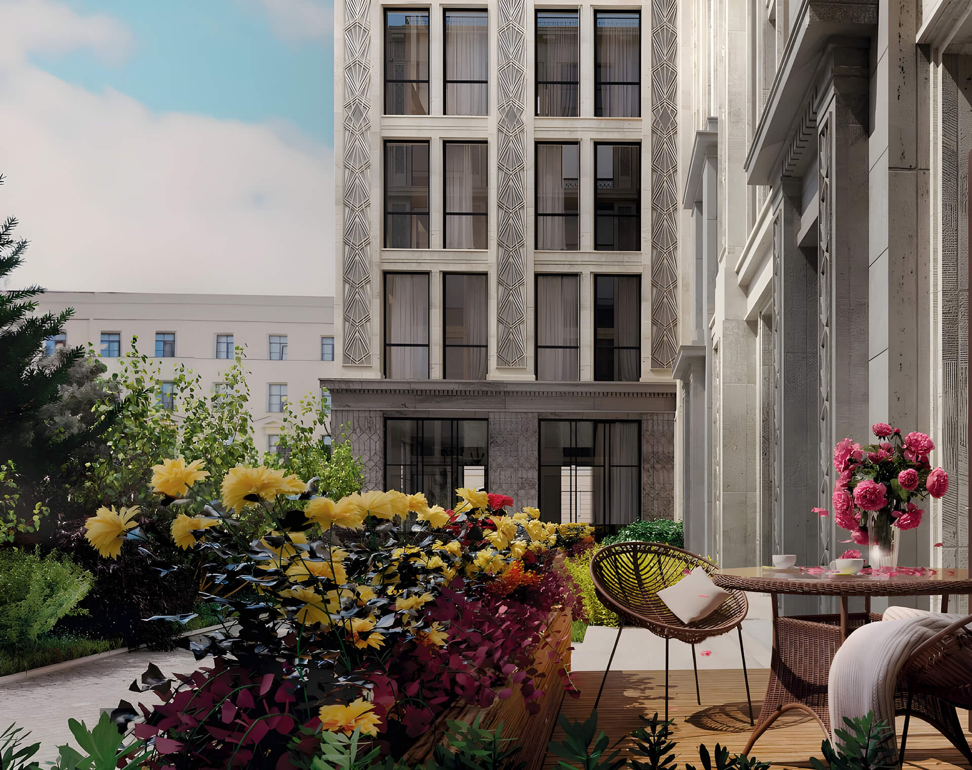 Ландшафтный дизайн двора вдохновлён традициями французского регулярного парка и прованса: здесь предусматриваются зелёные зоны, места для отдыха, прогулочные дорожки и детские игровые площадки. Это делает двор не просто функциональным, но и эстетически привлекательным, создавая ощущение камерного сада посреди города.