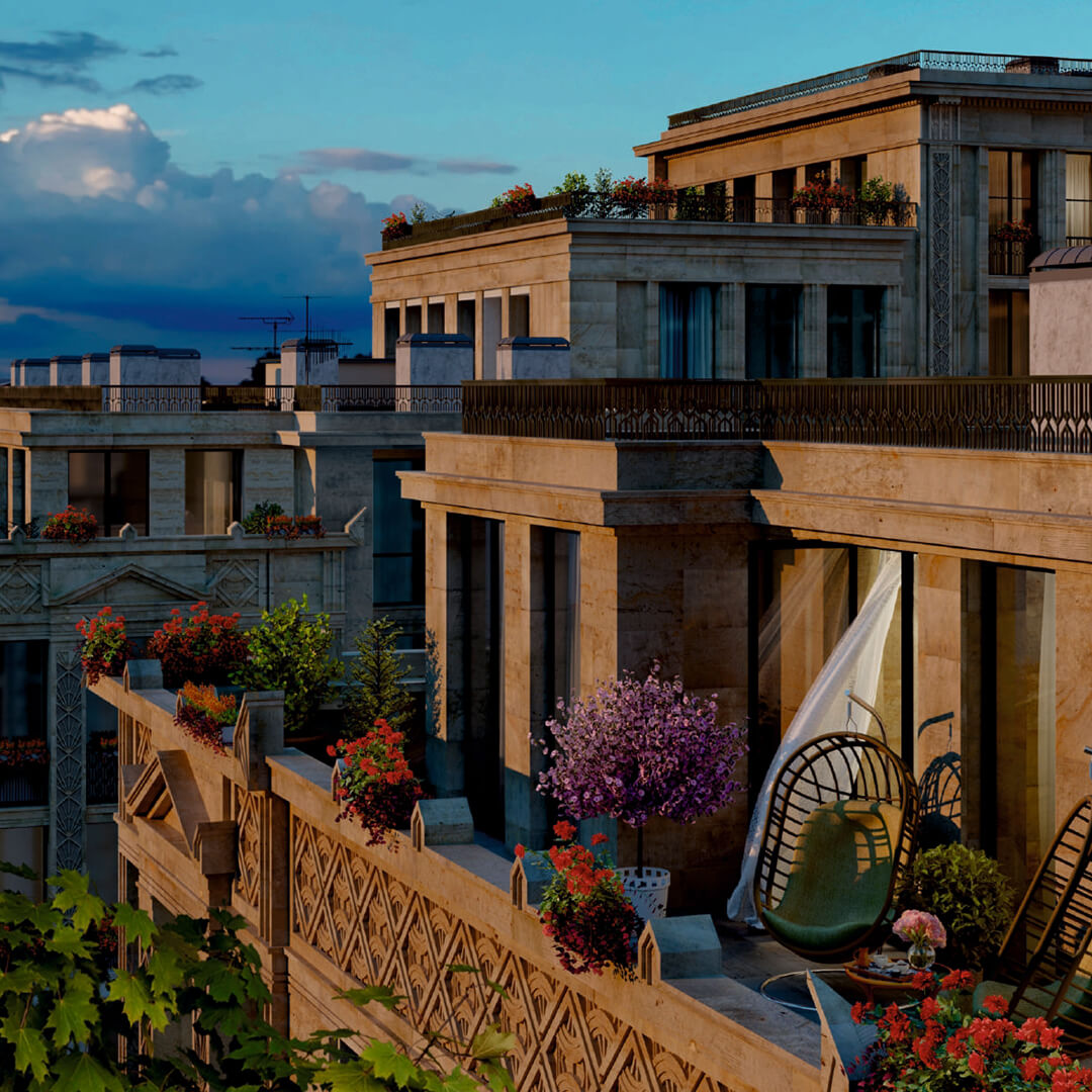Архитектурные и инженерные решения комплекса грамотно сочетаются: геометрия фасадов, большие окна, французские балконы и современные системы жизнеобеспечения создают гармоничную среду, где технологии служат эстетике и комфорту одновременно.